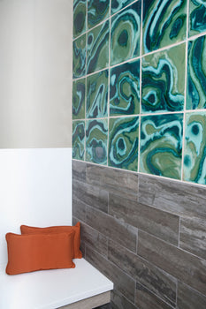 Mixing three colors Avocado/Aurora Borealis/Copper Patina creates these dynamic designs Andromeda is one of the most popular Cosmic Cloud. Tile artist Josh Blanc loves experimenting with non-traditional ceramic glazing techniques on handmade tile. Using thick, multi-layered glazes, overlapping and blending with each other, Josh melts them with temperatures nearing 2,000 degrees inside the kiln.